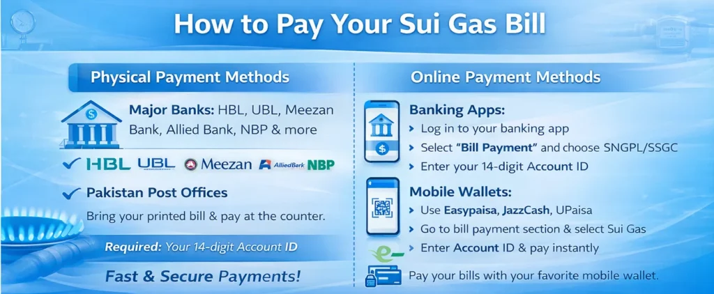 With Sui Gas Bill Online Check Duplicate 2026, customers can easily manage their monthly bills without waiting for the paper copy. Whether you are an SNGPL (Sui Northern Gas Pipelines Limited) or SSGC (Sui Southern Gas Company) consumer, this service allows you to instantly view, print and download your Sui Gas duplicate bill 2026. Enter your 14-digit Account ID and get your duplicate SNGPL bill online anytime. This feature is especially useful if your bill is lost or delayed. You can also make payments securely through online banking, Easypaisa or JazzCash. Using the Sui Gas bill check online Pakistan service ensures timely payments, avoids late fees and helps you keep proper records of your gas usage and expenses.